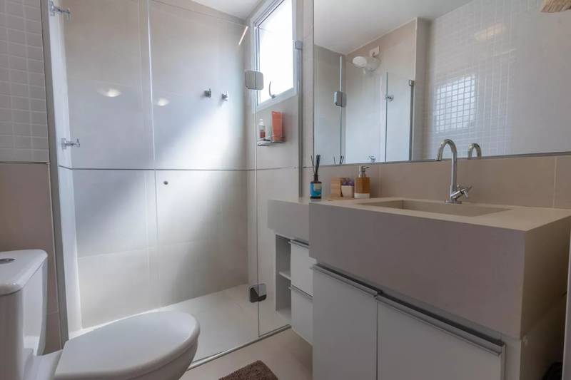 Banheiro social com espelho, bancada em granito, armários e box em Blindex