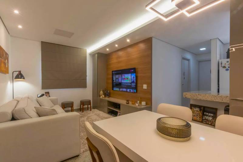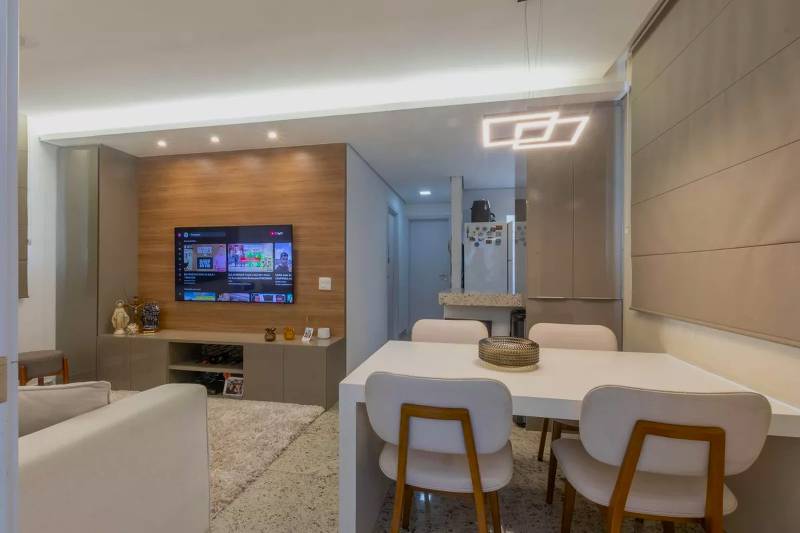 1 Sala ampla para dois ambientes com piso em granito, teto rebaixado e iluminação planejada